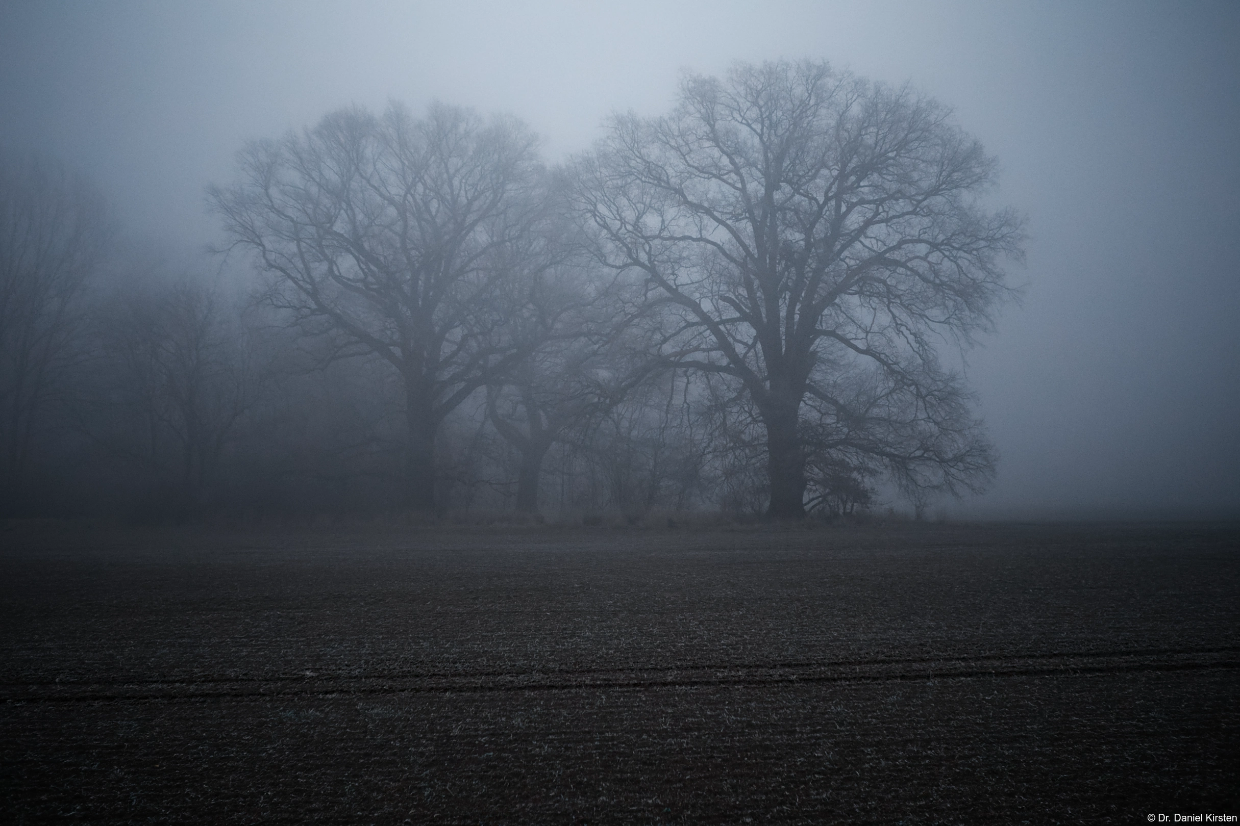 Eichen im Nebel bei Bad Dürrenberg am Jahresende 2025, Carl Zeiss Jena Tessar 2.8/50 red T 12 blade, Vollformat.