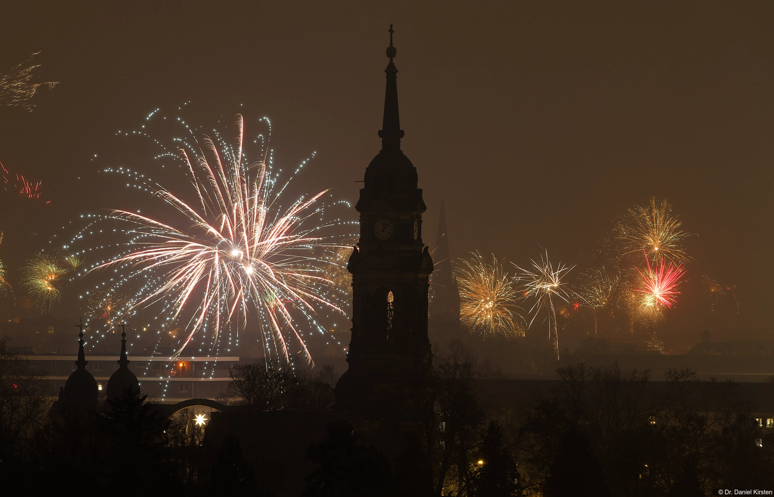 Die Trinitatiskirche zum Jahreswechsel 2025/26 in Dresden. Der Turm der Herz-Jesu-Kirche ist in Dunstr gehüllt. Canon EF70-200mm f/2.8L IS II USM bei 200mm, 3.2s belichtet, Vollformat.